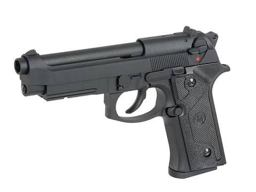 La pistola de airsoft KJ Works M92 VE-FM Blowback es una potente pistola de aire comprimido totalmente metálica, ideal para el campo de batalla. Esta pistola semiautomática permite alinear objetivos rápidamente con las miras blancas de 3 puntos y disparar BBs de airsoft. Incluye un sistema de hop-up ajustable y un riel inferior para accesorios.