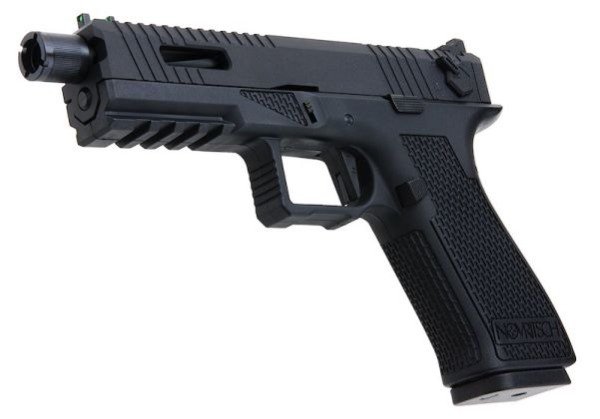 Esta pistola tiene el diseño de la serie G 18c y cabe en fundas hechas para las pistolas estilo Glock 17 o G serie 17. Fuera de la caja, la pistola tiene un estilo agresivo, hay una cola de castor extendida para evitar mordidas por deslizamiento, el agarre tiene textura y el deslizamiento tiene estrías y recortes que lo hacen liviano, fácil de agarrar y manipular. En los recortes también se puede ver el cañón exterior estriado.